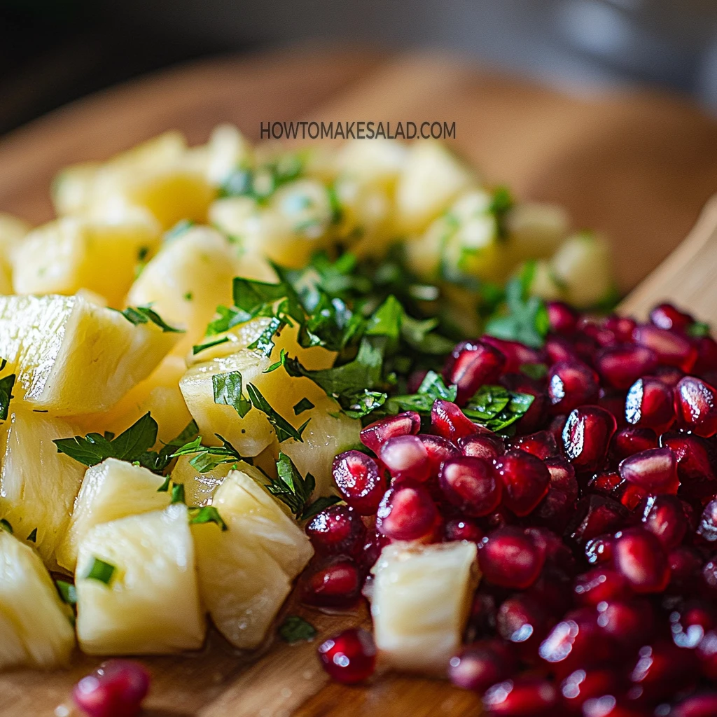 يتم تقطيع الاناناس والكابوتشي الاخضر والبصل وفرط حبات الرمان