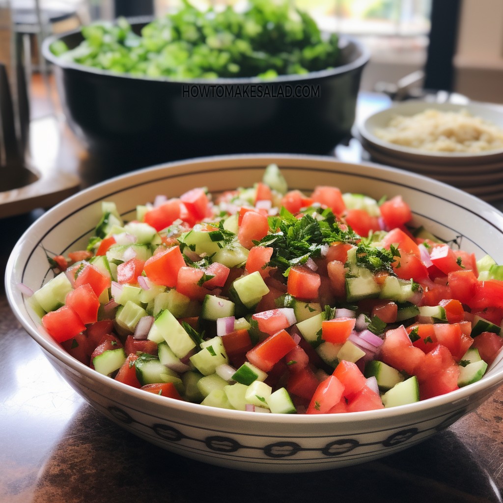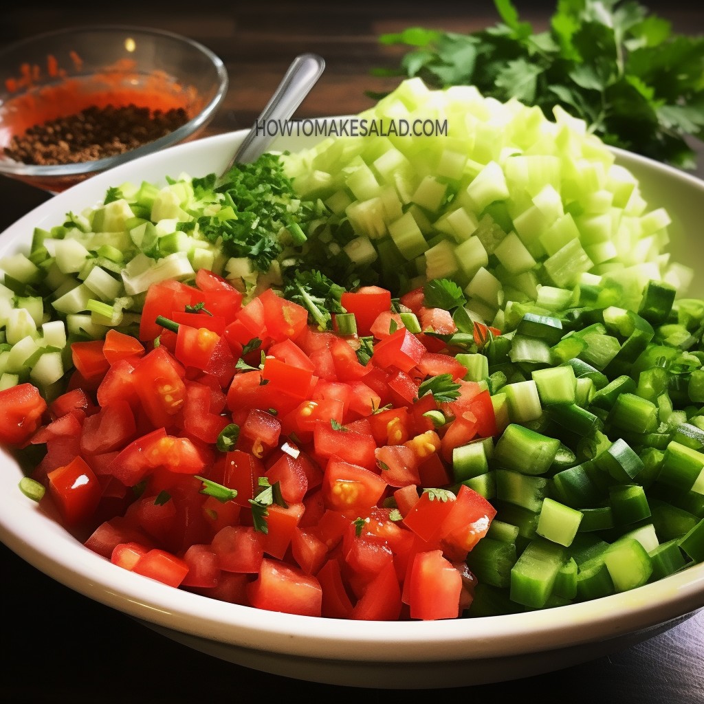يتم تقطيع البصل الاخضر او فرمه مع تقطيع الطماطم إلى قطع صغيرة
