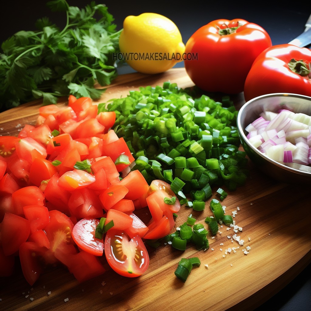 يتم تقطيع البصل الاخضر والفلفل الاخضر والطماطم وخلطهم جميعاً