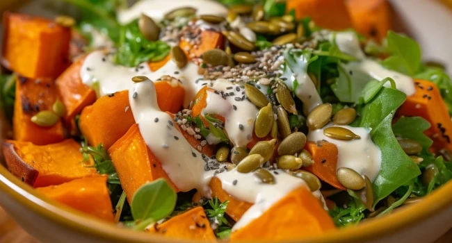 تتميز "سلطة البطاطا الحلوة" من أشهى الأطباق الصحية التي تجمع بين الطعم الحلو الطبيعي والقيمة الغذائية العالية بفضل مكوناتها الغنية بالفيتامينات والمعادن ومضادات الأكسدة مثل فيتامين A وC والبوتاسيوم والألياف القابلة للذوبان مما يجعلها خيارًا مثاليًا لمن يبحث عن وجبة خفيفة تُشبع الحواس وتدعم الصحة في آنٍ واحد وتُعد أيضًا مناسبة جدًا لمَن يعانون من النحافة أو يحتاجون إلى وجبات غنية بالعناصر المفيدة دون الاعتماد على منتجات مصنعة أو سكريات مضافة كما أنها تمنح طاقة ثابتة ومستقرة للجسم بسبب المؤشر الجلايسيمي المنخفض للبطاطا الحلوة ويمكن تناولها كطبق جانبي مغذي أو كوجبة رئيسية ضمن خطط الرجيم أو الدايت النباتي أو حتى كبديل لحلويات غير صحية مما يجعلها مفضلة لدى خبراء التغذية والمهتمين بالتوازن الغذائي والطعام النظيف.