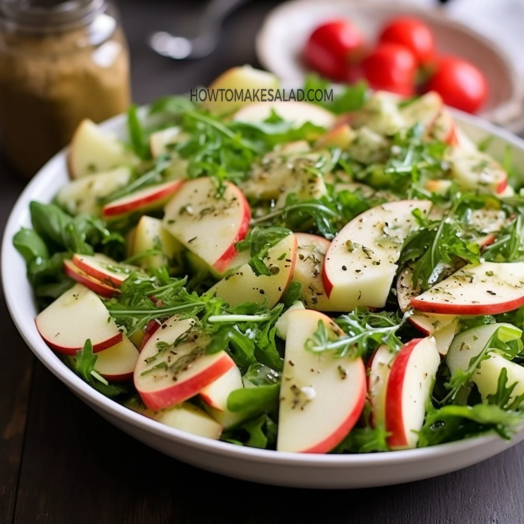 يتم تقطيع التفاح إلى شرائح مع تقطيع الجرجير والطماطم والخس