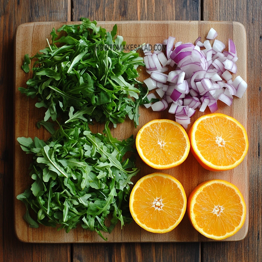 يتم تقطيع البرتقال واوراق الجرجير إلى قطع متوسطة